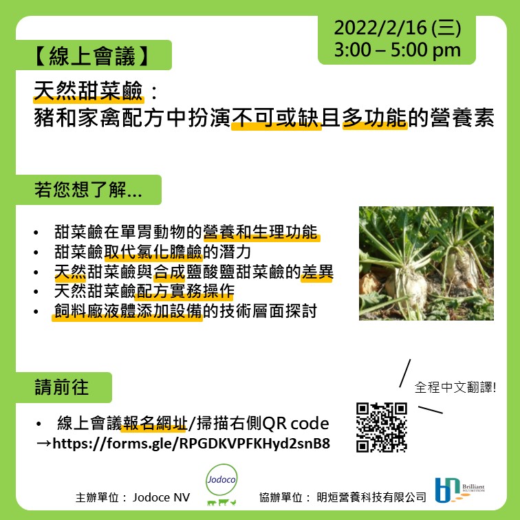 【線上會議】天然甜菜鹼:豬和家禽配方中扮演不可或缺且多功能的營養素
