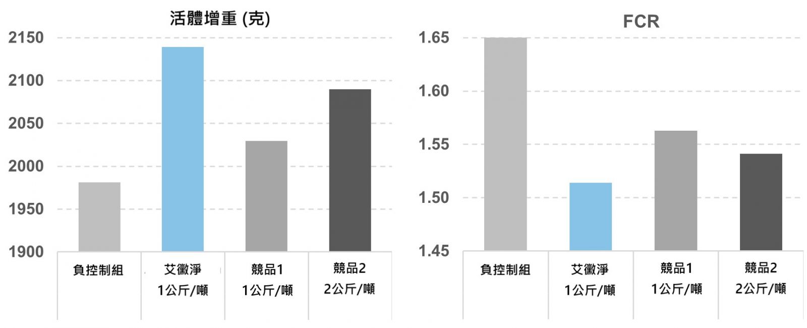 此外,飼料效率 (FCR)改善優於負控制組 (-8.8%)、競品一 (-3.2%)和競品二 (-1.8%)。