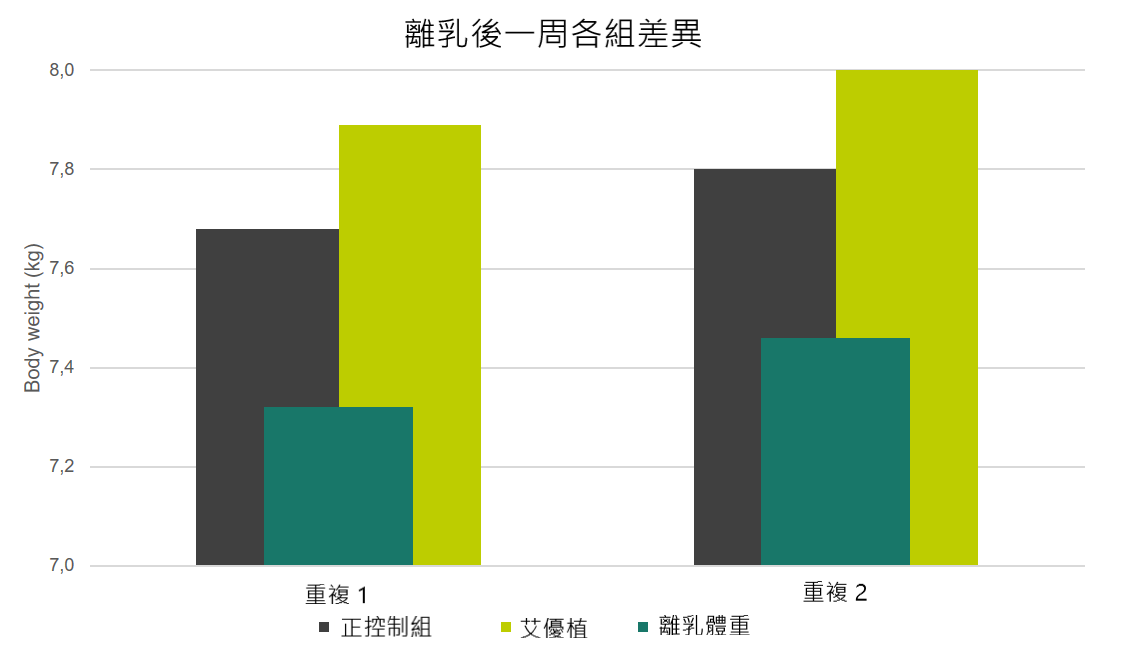 這個試驗比較了抗生素生長促進劑的效力和植生素添加劑艾優植™ (AntaPhyt; Dr. Eckel Animal Nutrition)。數字是不會騙人的:與抗生素生長促進劑相比,使用植生素添加劑的組別顯示了更好的生長表現和飼料效率。事實上,早在離乳後第一週,這個組別就已經顯示了每隻動物平均每日增重高200克。這個優勢維持整個保育期,最終體重比控制組高了2公斤。